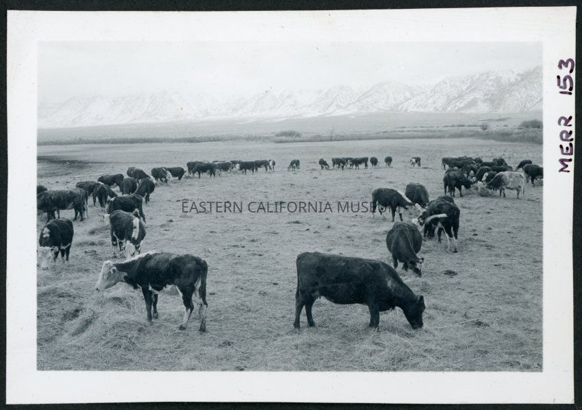 Photograph of cattle in a field, presumably at Manzanar with the Sierra Nevada in the background.
