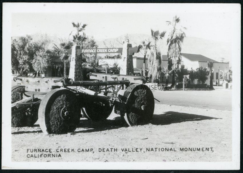 Photograph of the entrace to Furnace Creek Camp, with the entryway in the background along with palm trees. An abandoned wagon is prominently featured in the foreground.