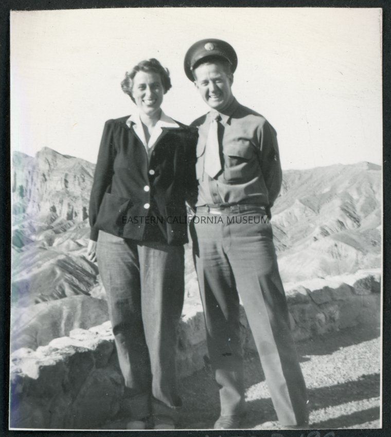 Photograph of two people standing at the lookout at Zabriskie Point in Death Valley National Park. One of the individuals is an army guard.