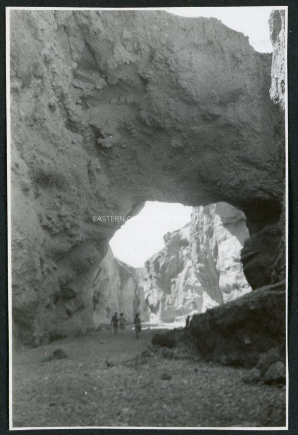 Photograph of three people walking under the Natural Bridge in Death Valley National Park. They are walking away from the camera.Collection