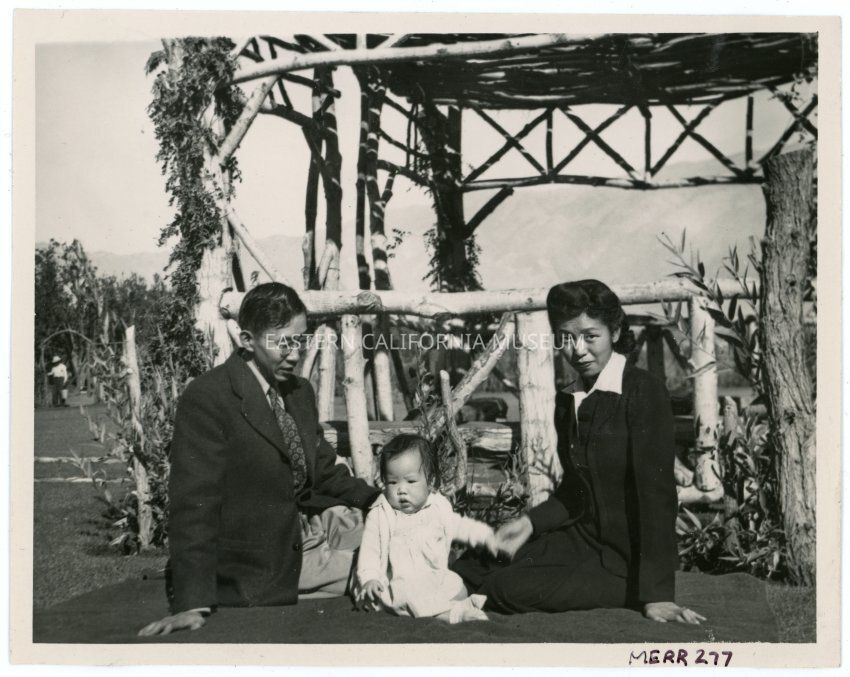 Photograph of Lillian and Harry Matsumoto, superintendents of the Children's Village at Manzanar Incarceration Camp, and a baby sitting in the park near the Children's Village.