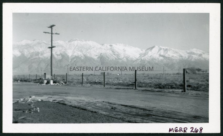 Photograph of the road outside of Manzanar Incarceration Camp. A utility pole is next to the road and a barbed wire fence follows the road. The snow-covered Sierra Nevad are in the background. In the lower left corner is a tricycle.