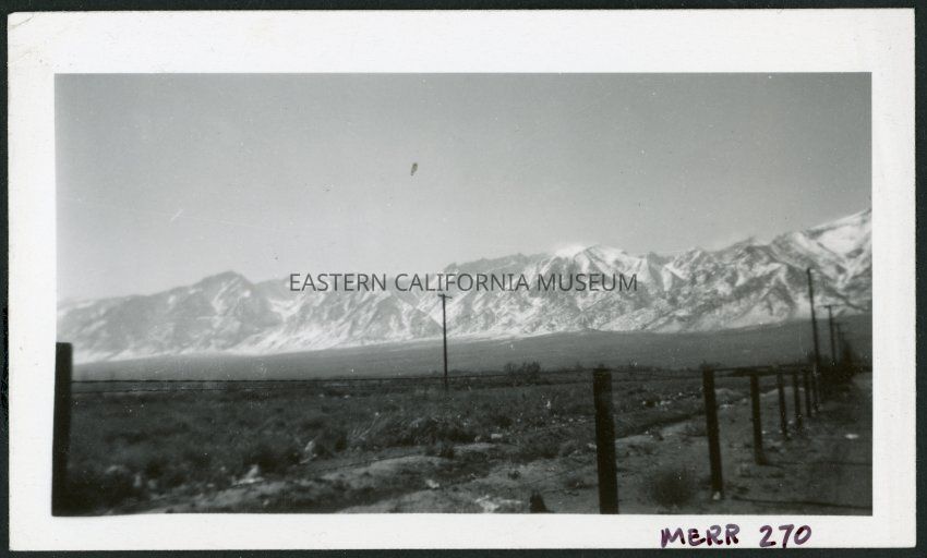Photograph looking across the desert toward the snow-covered Sierra Nevada. The barbed wire fence surrounding Manzanar is visible along with a line of utility poles.Collection