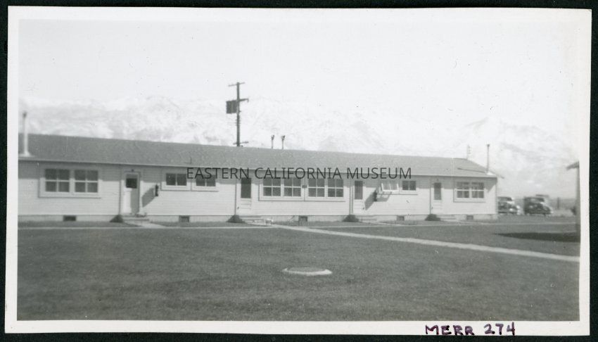 Photograph of a grassy field in front of evacuee -built staff houseing at Manzanar Incarceration Camp. The snow-covered Sierra Nevada can be seen in the background. Two cars are visible in the middle right of the photograph.