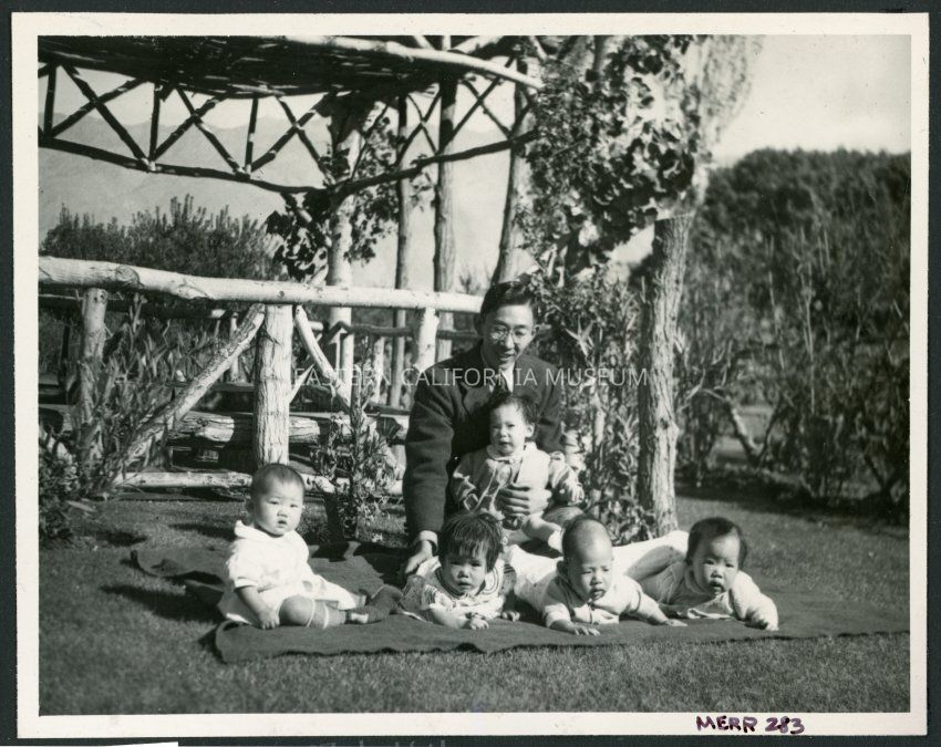Photograph of Henry Matsumoto, superintendent of the Children's Village, with five babies sitting on a blanket at the park in the Children's Village at Manzanar Incarceration Camp. Three of the babies are laying on the stomachs, one is being held by Henry, and the fifth is sitting upright on their own.