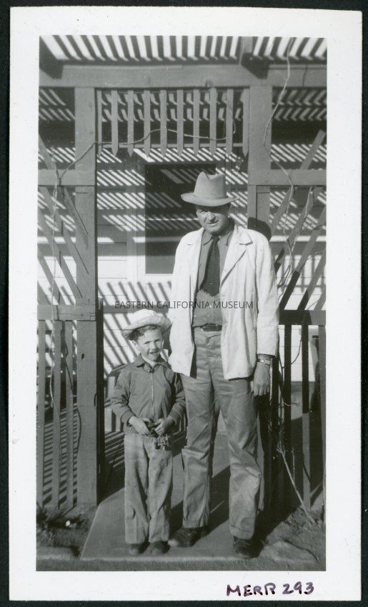 Photograph of Arthur M. Sandridge and his son in front of staff housing at Manzanar Incarceration Camp. They are standing in front of the fenced-in patio area.Collection