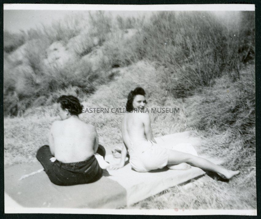 Photograph of two women sunbathing topless on a blanket near Manzanar Incarceration Camp.Collection