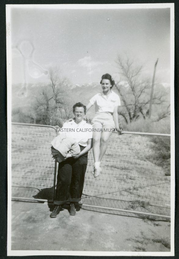 Photograph of Martha Shoaf standing in front of a gate with another woman sitting on top of the gate. Martha is holding a bundle of fabric. The background are several bare trees and the Sierra Nevada.Collection