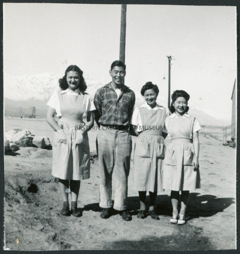 Photograph of four hospital staff standing in front of a utility pole with the Sierra Nevada in the background at Manzanar Incarceration Camp. The corner and front steps of a building can be seen on the right side.Collection