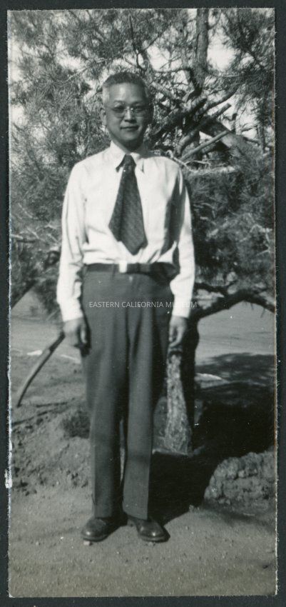 Photograph of a unidentified man posing in front of a tree at Manzanar Incarceration Camp. He is wearing a shirt and tie with dress slacks.Collection