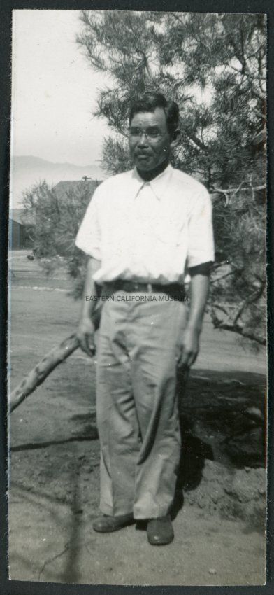 Photograph of "man of all trades" posing in front of a tree at Manzanar Incarceration Camp. A building can be seen in the background. Caption reads: Man of all trades. Caption taken from the original photo album.Collection