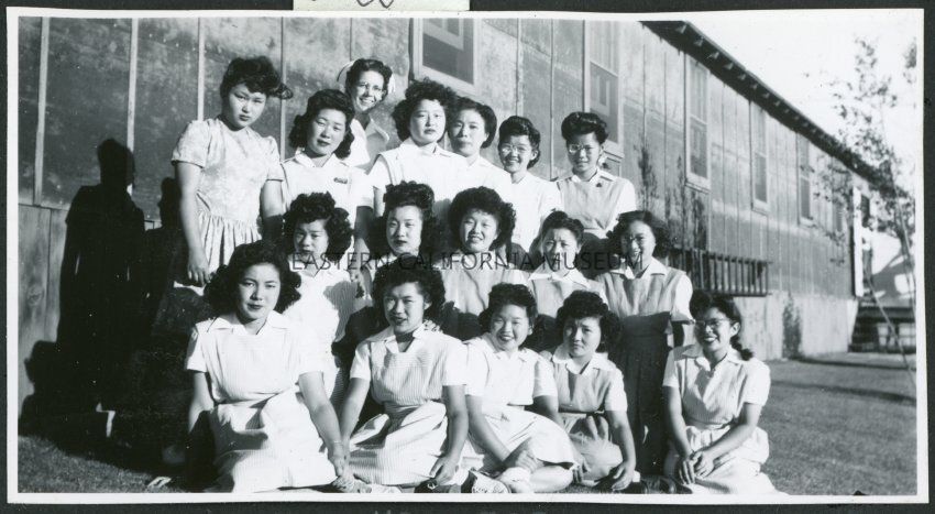 Photograph of Dagmar Quarnstrom and the hospital staff aides in front of the Manzanar hospital at the Manzanar Incarceration Camp.Collection