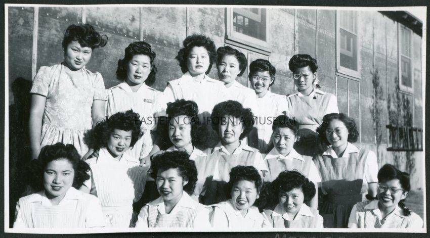 Photograph of the hospital staff aides in front of the Manzanar hospital at the Manzanar Incarceration Camp.Collection