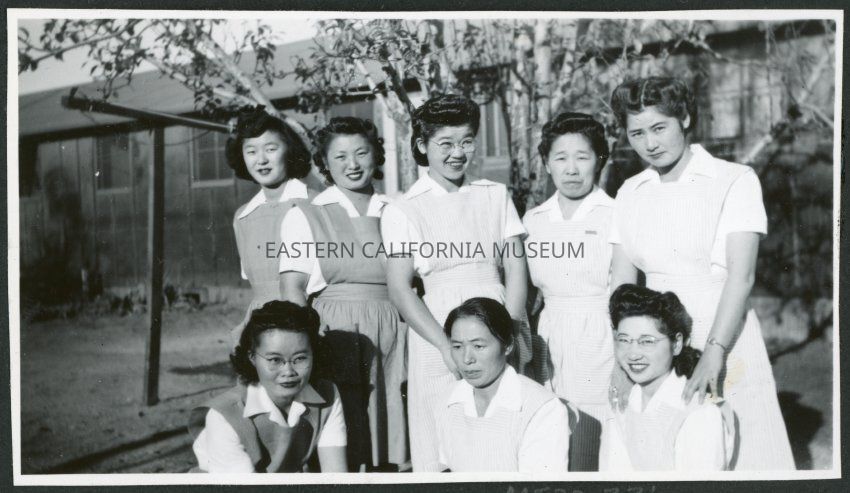 Photograph of eight hospital staff aides posing in front of the Manzanar hopsital at the Manzanar Incarceration Camp. There is a clothes pole behind them.Collection