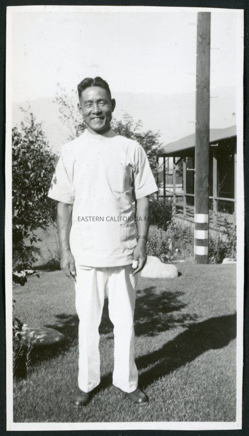 Photograph of smiling male hospital staff posing near the Manzanar hospital at the Manzanar Incarceration Camp. There is a utility pole behind him and a building with a covered porch.Collection