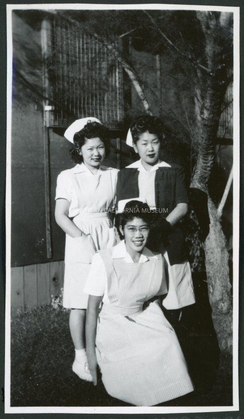 Photograph of three nurses posing in front of a building at Manzanar Incarceration Camp, possibly the hospital. A screen covered window on tar-papered walls is visible behind a tree.Collection