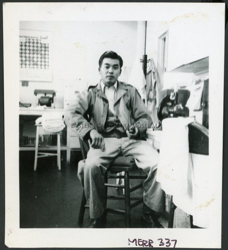 Photograph of a male lab technician sitting in front of his microscope. Other equipment can be seen on the workstations. He is in the laboratory of the Manzanar hospital.Collection