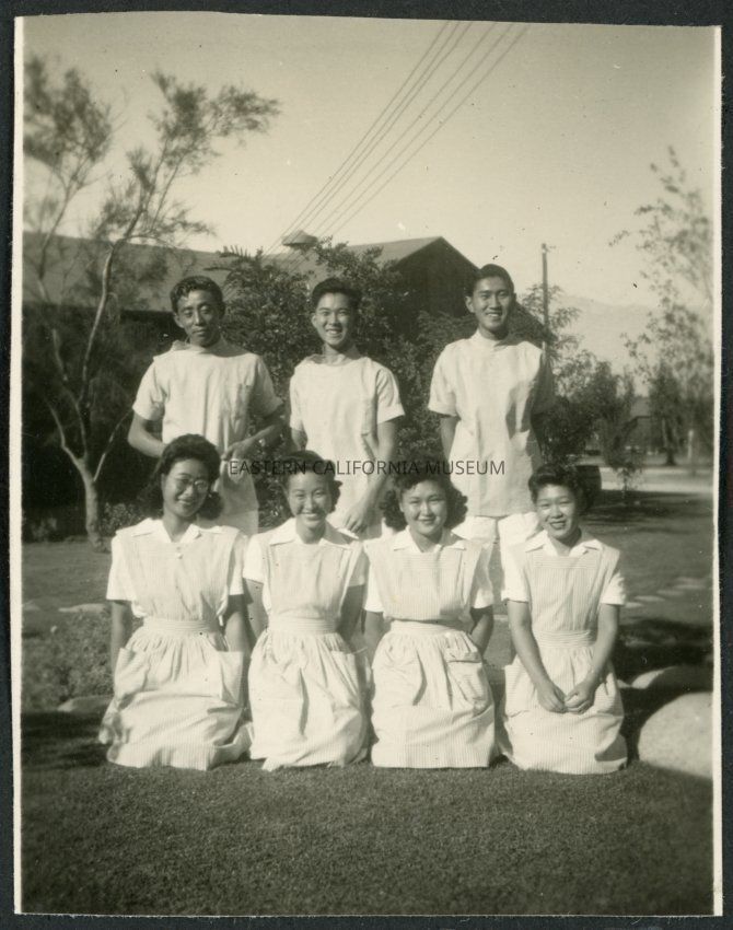 Photograph of seven hospital staff posing on the grass in front of the Manzanar hospital. The four women are kneeling in the front row and the three men are standing behind them. In the background, landscaping and buildings are visible.Collection