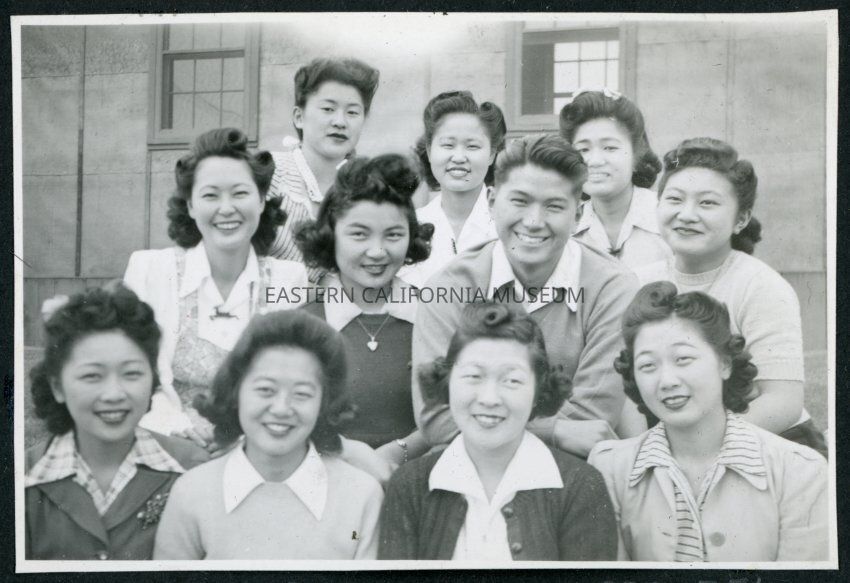 Photograph of eleven people posing in front of a building at Manzanar Incarceration Camp. It is a group of ten women and one man.Collection