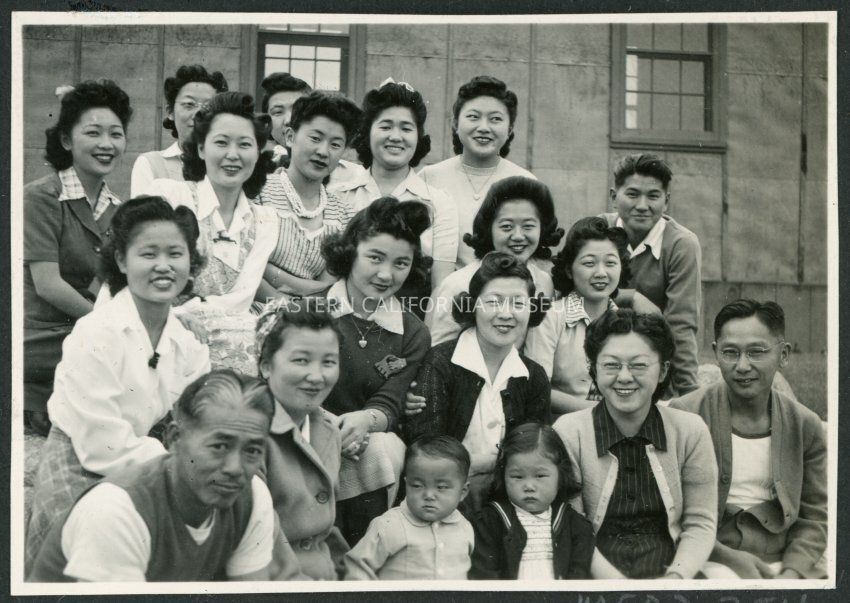 Photograph of a group of men, women and two children posing on the rocks in the hospital garden in Manzanar Incarceration Camp.Collection