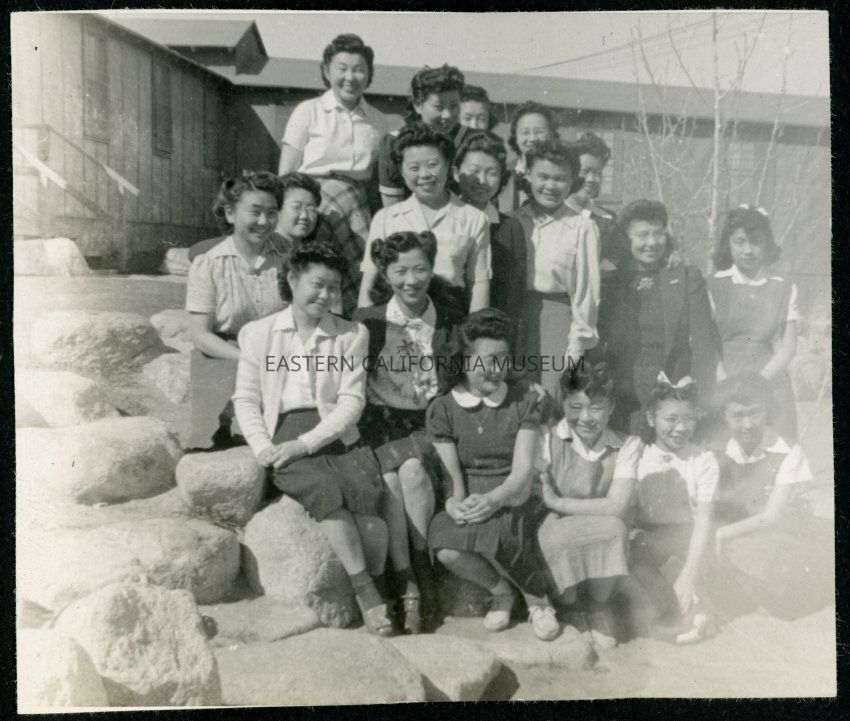 Photograph of a group of women and girls posing on the rocks in the hospital garden in Manzanar Incarceration Camp.Collection