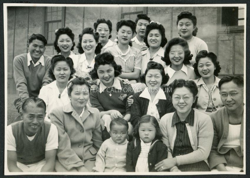 Photograph of a group of men, women and two children posing on the rocks in the hospital garden in Manzanar Incarceration Camp.Collection