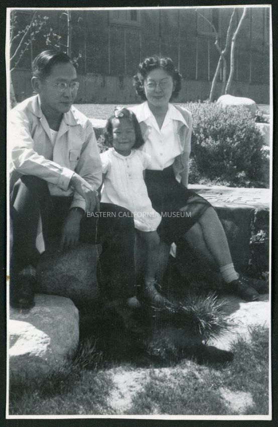 Photograph of Dr. and Mrs. Jiro Muramoto with daughter posing in the hospital garden at Manzanar Incarceration Camp.Collection