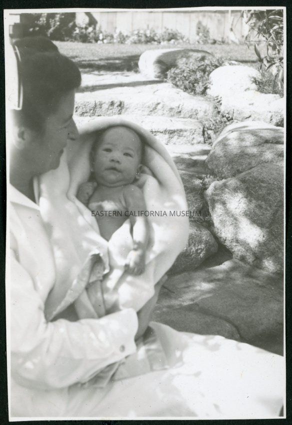Photograph of Irene Gavigan, R.N., holding a newborn at Manzanar Incarceration Camp. She is sitting on the rock bench in the hospital garden.Collection