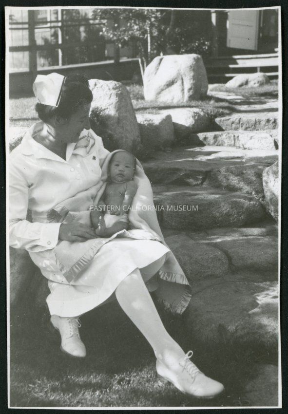 Photograph of Irene Gavigan, R.N., holding a newborn at Manzanar Incarceration Camp. She is sitting on the rock steps in the hospital garden.Collection