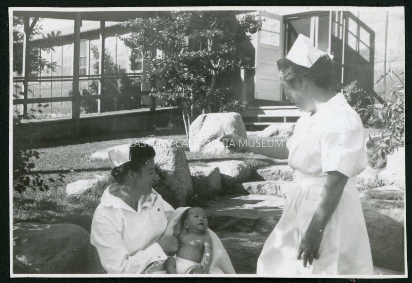 Photograph of Irene Gavigan, R.N., holding a newborn while another nurse attracts his attention at the Manzanar Incarceration Camp. They are located in the steps leading to the entrance of the hospital.Collection