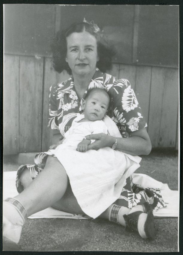 Photograph of Irene Gavigan holding an infant while sitting on a blanket in front of a building at Manzanar Incarceration Camp. The building is possibly the hospital.Collection