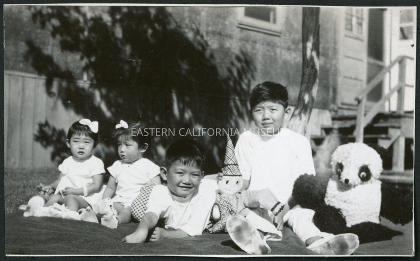 Photograph of four young children on a blanket with toys in front of a building at Manzanar Incarceration Camp. Behind them is a set of steps and door to a building, possibly the hospital. The toys include a panda bear and a clown.Collection
