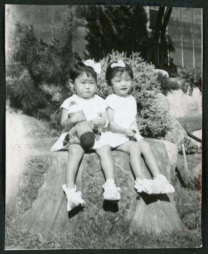 Photograph of two young girls sitting on a stump in front of a building at Manzanar Incarceration Camp. One of the girls is holding an animal. The building is possibly the hospital.Collection