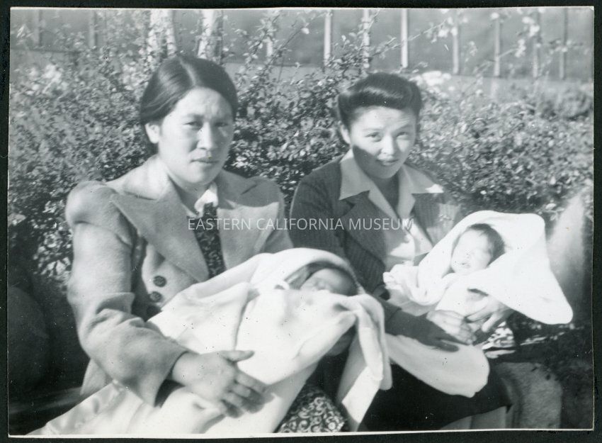 Photograph of two women holding infants while sitting in front of a building at Manzanar Incarceration Camp. They are probably in the hospital garden. Both women are wearing jackets and the infants are swaddled in large white blankets. This photo is slightly out of focus.Collection