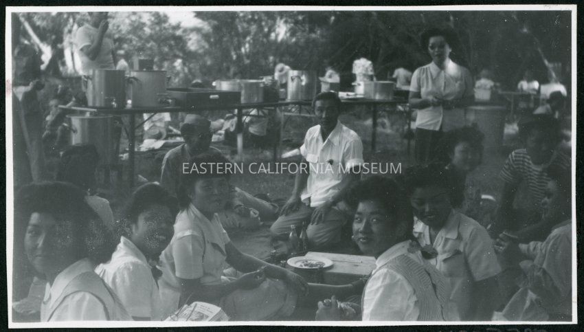 Photograph of several nurses sitting on the ground at a Manzanar hospital staff picnic. Several additional people can be seen behind them. In the background are a line of tables with pots and trays stacked on them.Collection