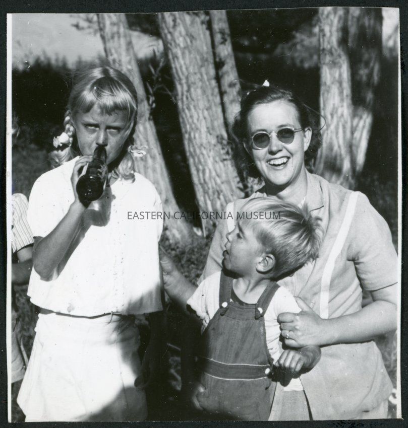 Photograph of three people, including two children, at a Manzanar hospital staff picnic. The girl is drinking from a glass bottle, and the boy is wearing overalls.Collection