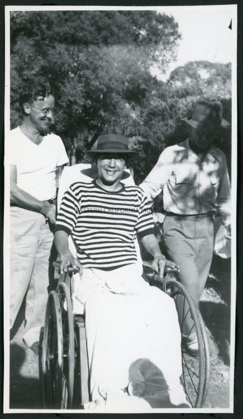Photograph of Dr. Morse Little and two men, one in a wheelchair wearing a striped shirt, at Manzanar Incarceration Camp. Trees can be seen in the background.Collection