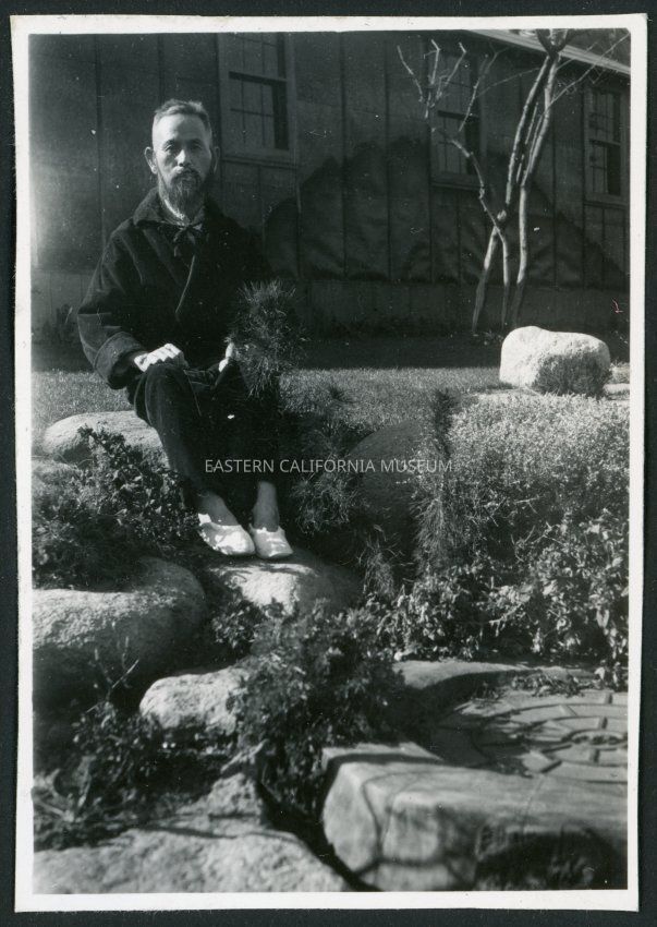 Photograph of a man in a robe wearing slippers sitting on a rock wall in the hospital garden at Manzanar Incarceration Camp. The hospital is visible behind him with a manhole cover in the foreground.Collection