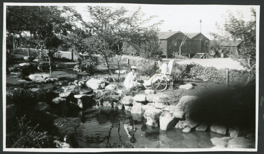 Photograph of Peter Hondo in a wheelchair with Thelma McBride squatting down next to him near a pond in Manzanar Incarceration Camp. A mess hall and barracks are visible in the background.Collection
