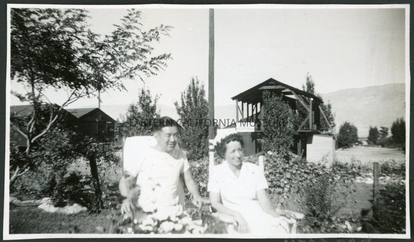 Photograph of Peter Hondo and Thelma McBride in a park at Manzanar Incarceration Camp with several buildings and a covered water tank in the background.Collection