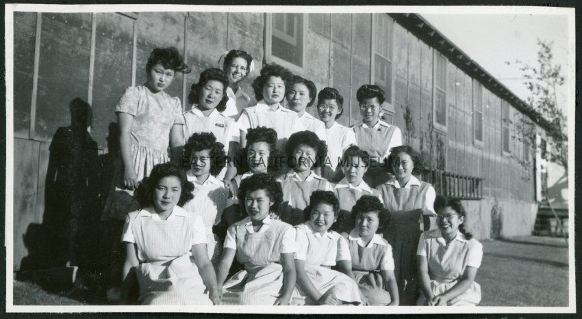 Photograph of a group of hospital staff aides posing in front of the Manzanar hospital. Sixteen women are posed with most of them wearing hospital uniforms.Collection