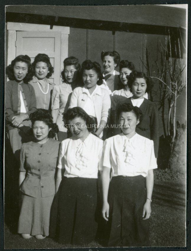 Photograph of female hospital staff posing in front of the Manzanar hospital. Ten women are visible wearing skirts, blouses and cardigans. The front three are kneeling and the other seven are standing behind them. An entrance is visible behind them.Collection