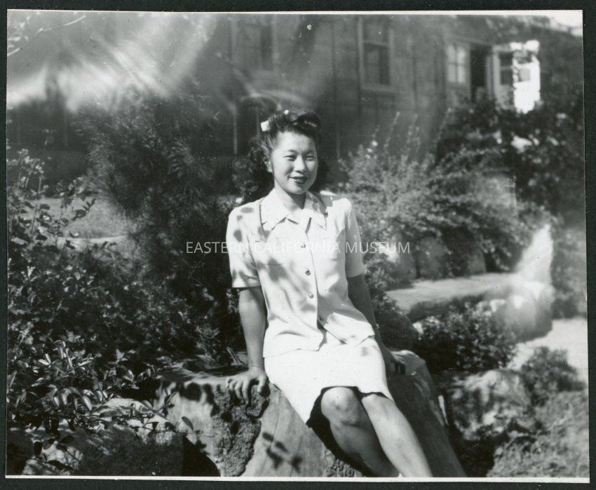 Photograph of a woman sitting on a rock in the hospital garden at Manzanar Incarceration Camp. An entrance to the hospital can be seen behind her.Collection