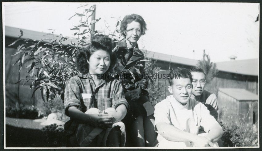 Photograph of two women and two men posing in front of a building at Manzanar Incarceration Camp. An attached shed to the hospital is visible behind them.Collection