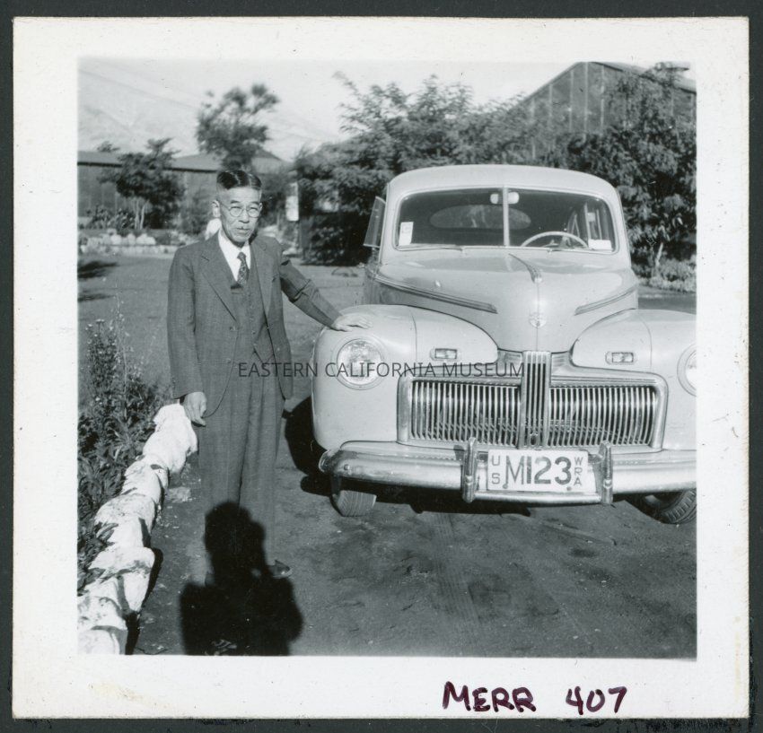 Photograph of a man standing next a car while resting his hand on it at Manzanar Incarceration Camp. Behind him the hospital garden and building are visible. The car is a WRA vehicle with license plate, "US WRA M123".Collection