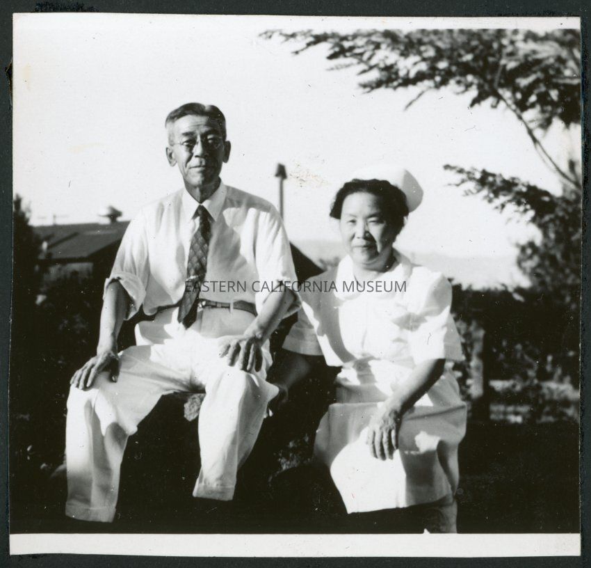 Photograph of a couple sitting in front of trees and buildings at Manzanar Incarceration Camp. The woman is wearing a nurses uniform.Collection