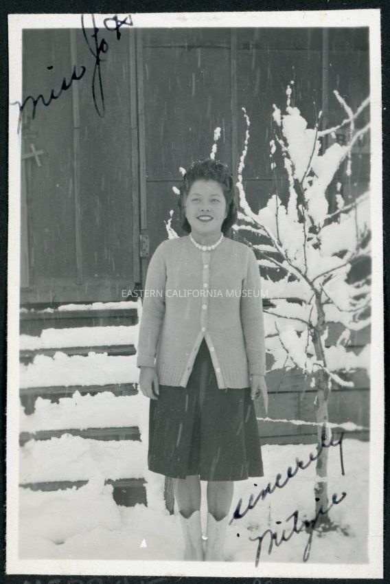 Photograph of Mitzie standing in snow in front of building at Manzanar Incarceration Camp. She is wearing a dress and cardegan with boots and a necklace. The photograph is signed, "Miss Jo Hawes, Sincerely Mitzie".Collection