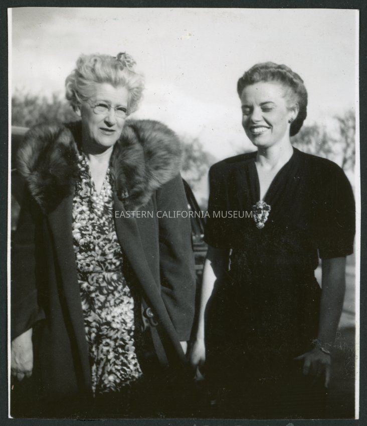 Photograph of Christine Little and another women standing in front of a car at Manzanar Incarceration Camp. One of the women is wearing a fur-trimmed coat. Behind them trees are visible.Collection