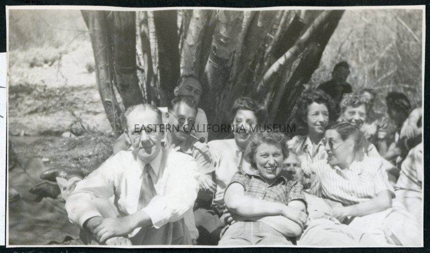 Photograph of a group of people, including David Stingley, relaxing under a tree near Manzanar Incarceration Camp at a hospital staff picnic.Collection