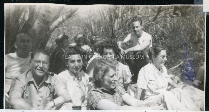 Photograph of Paul and Silvia Maier, B. Feitis and seven others sitting on the ground under trees near Manzanar Incarceration Camp at a hospital staff picnic.Collection